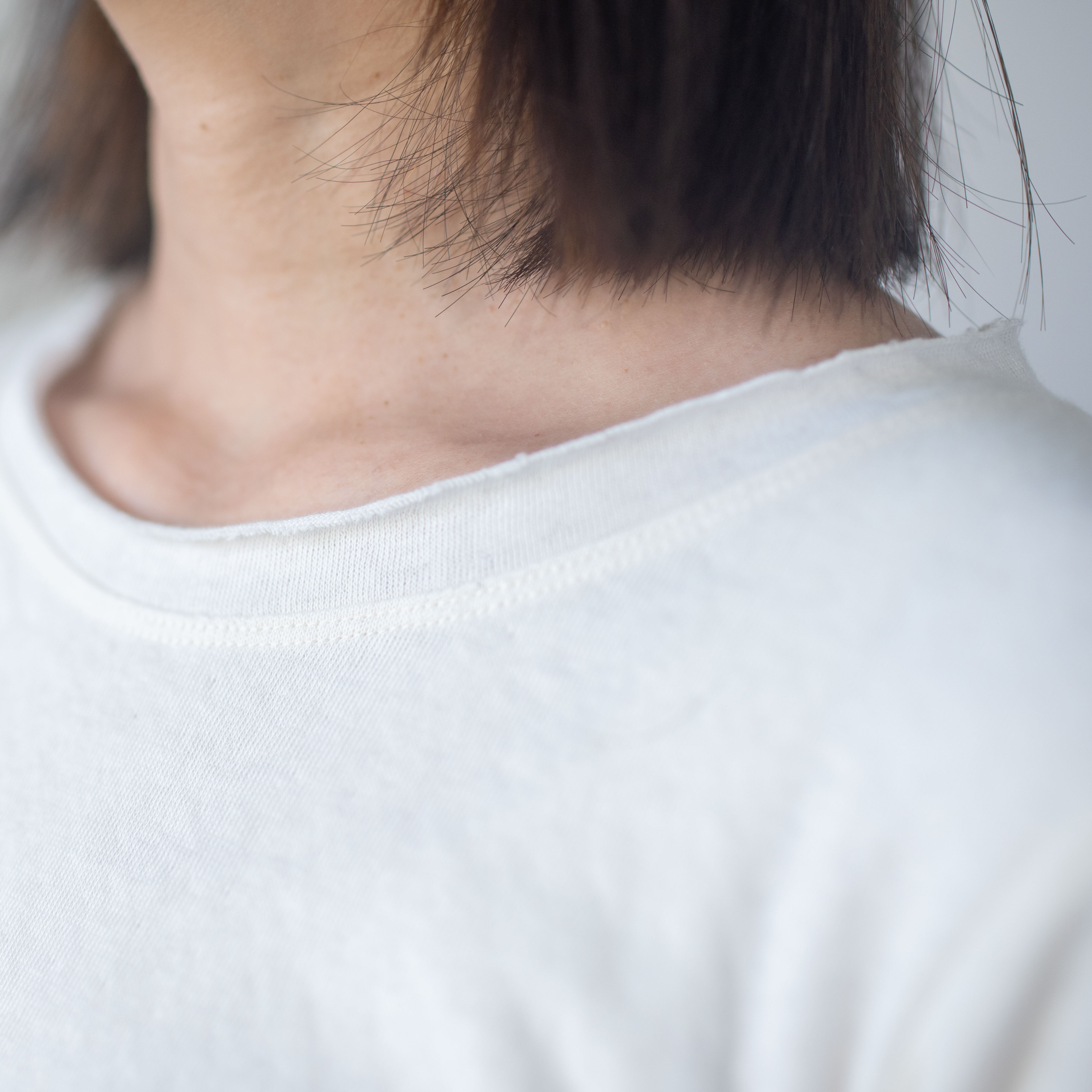 とても柔らかく、サンマルと呼ばれる薄手の天竺の2重編みなので引っ掛けや引っ張りにはデリケートです。また、単糸編みなので斜行しやすいのも特徴です。それが柔らかさの素でもあります。