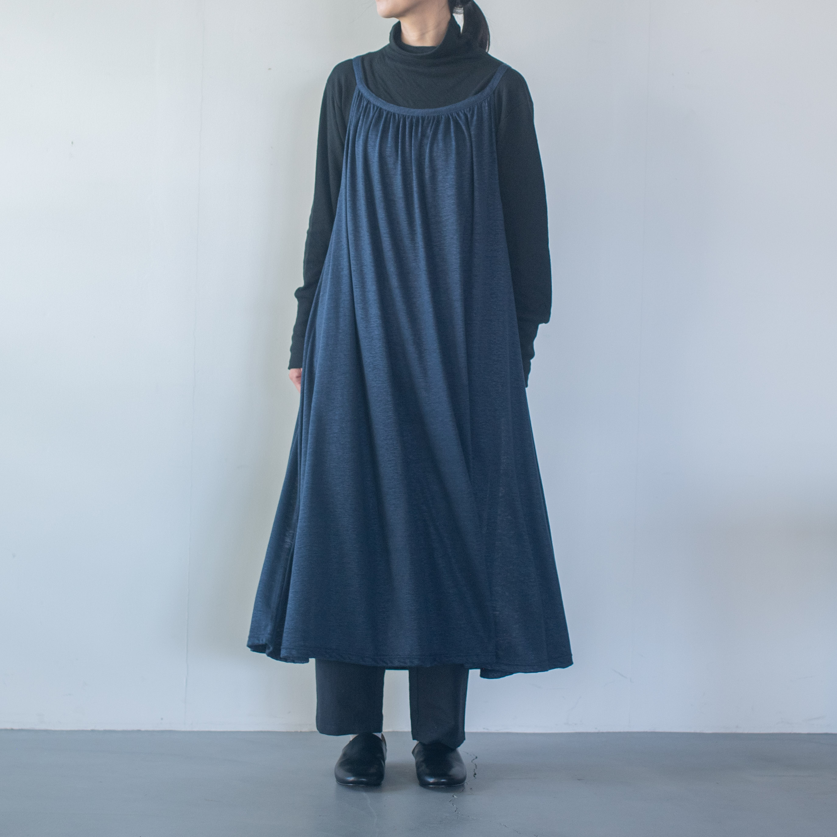 たっぷり取ったギャザーは落ち感がある分ボリュームダウンして、動く度にいろんなシルエットが楽しめるワンピースです。
