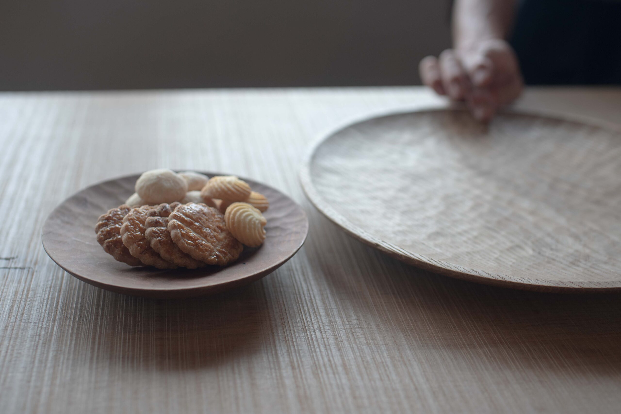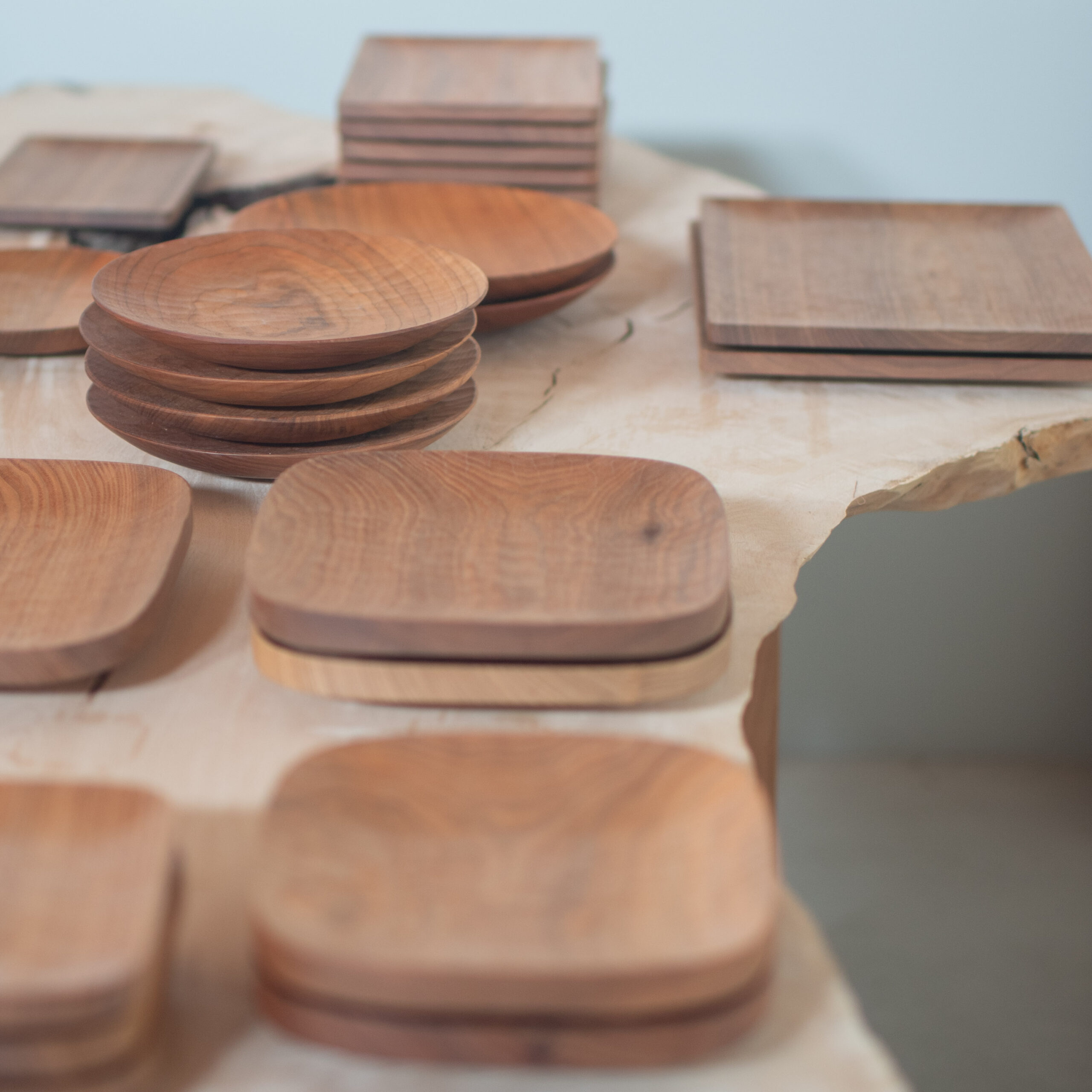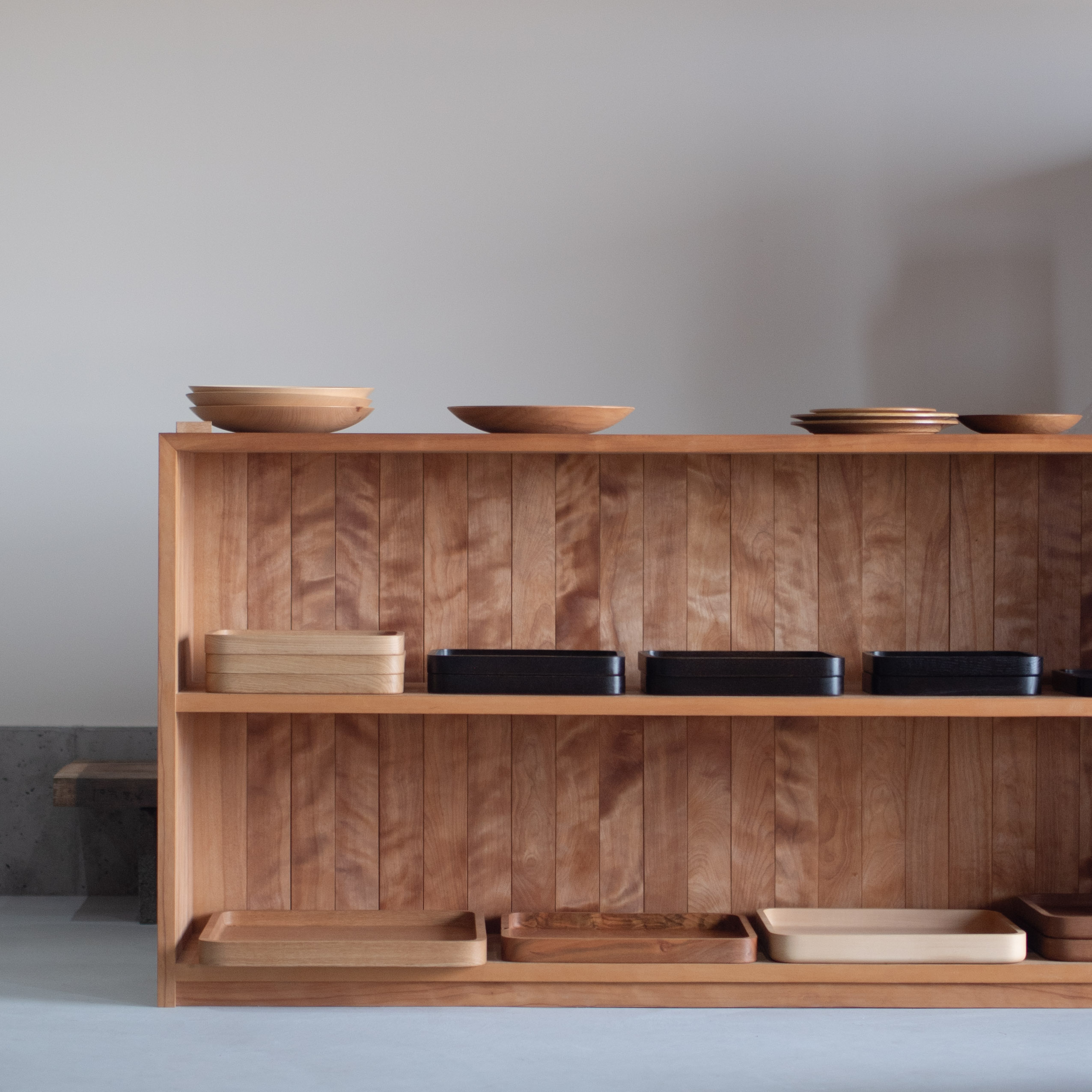 手彫りの跡が美しい定番の四角皿、丸皿をはじめ、たっぷりとしたオーバル皿、端正な盆など、これからの日々に寄り添う道具たちが並びます。